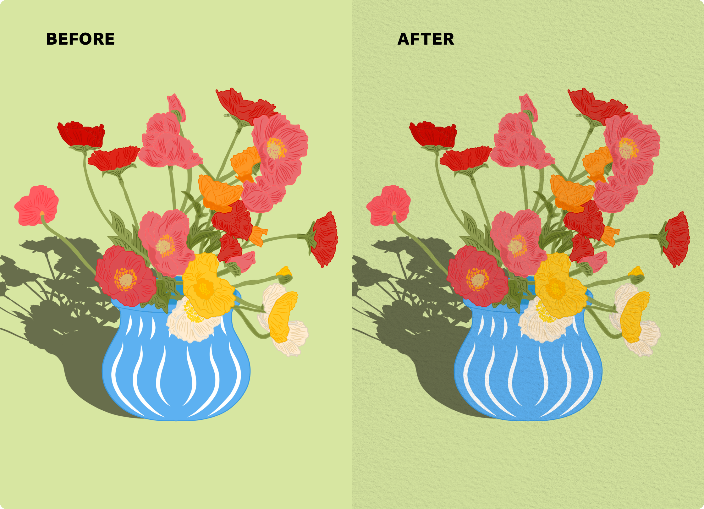 Artists often want their digital work to feel less “flat” and more tactile by adding details like paper grain, fabric textures, or effects such as grain, halftones, gradient overlays. In Adobe Fresco, there wasn’t an easy or integrated way to bring these analog qualities into the canvas.